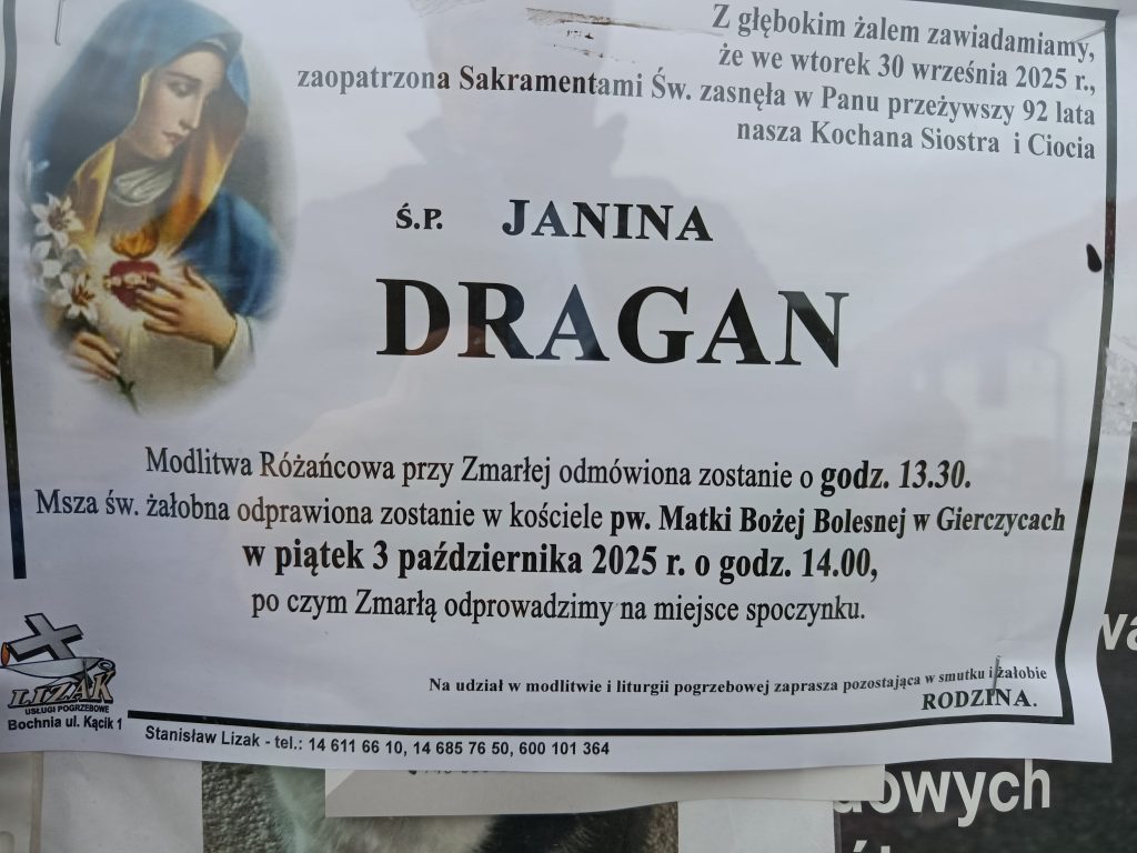 Pogrzeb zmarłej śp. Krystyny odbędzie się we wtorek 20 listopada 2019 roku o godz. 1300 w kościele parafialnym Matki Bożej Bolesnej w Gierczycach.