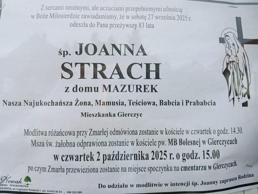 Pogrzeb zmarłej śp. Marii odbędzie się w środę 19 lutego 2020 roku o godz. 1430 w kościele parafialnym Matki Bożej Bolesnej w Gierczycach. Półgodziny wcześniej różaniec za zmarłą śp. Marię Rafalską.